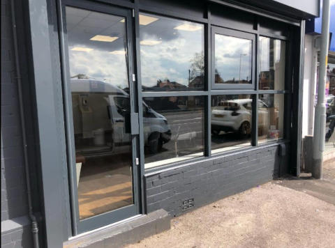 Commercial shop front supplied and fitted in Reddish, Manchester, with a pivot door and a commercial specified frame